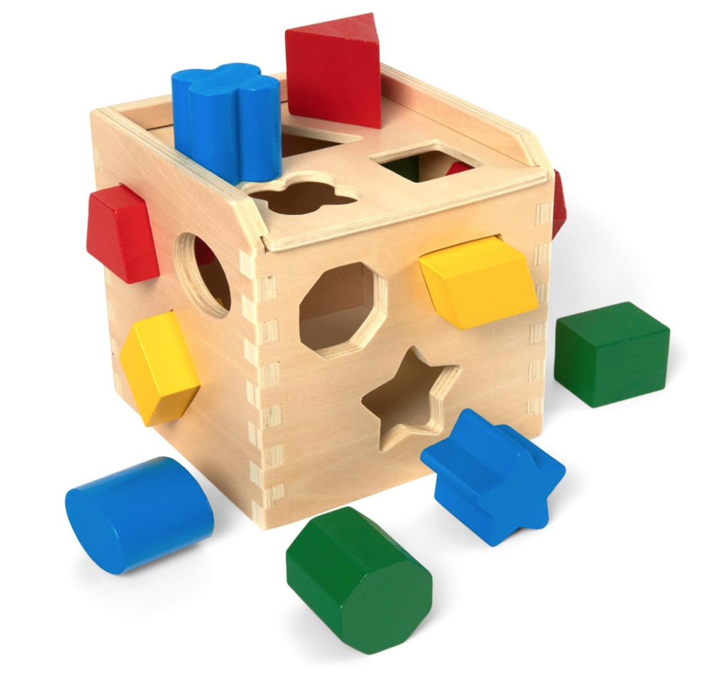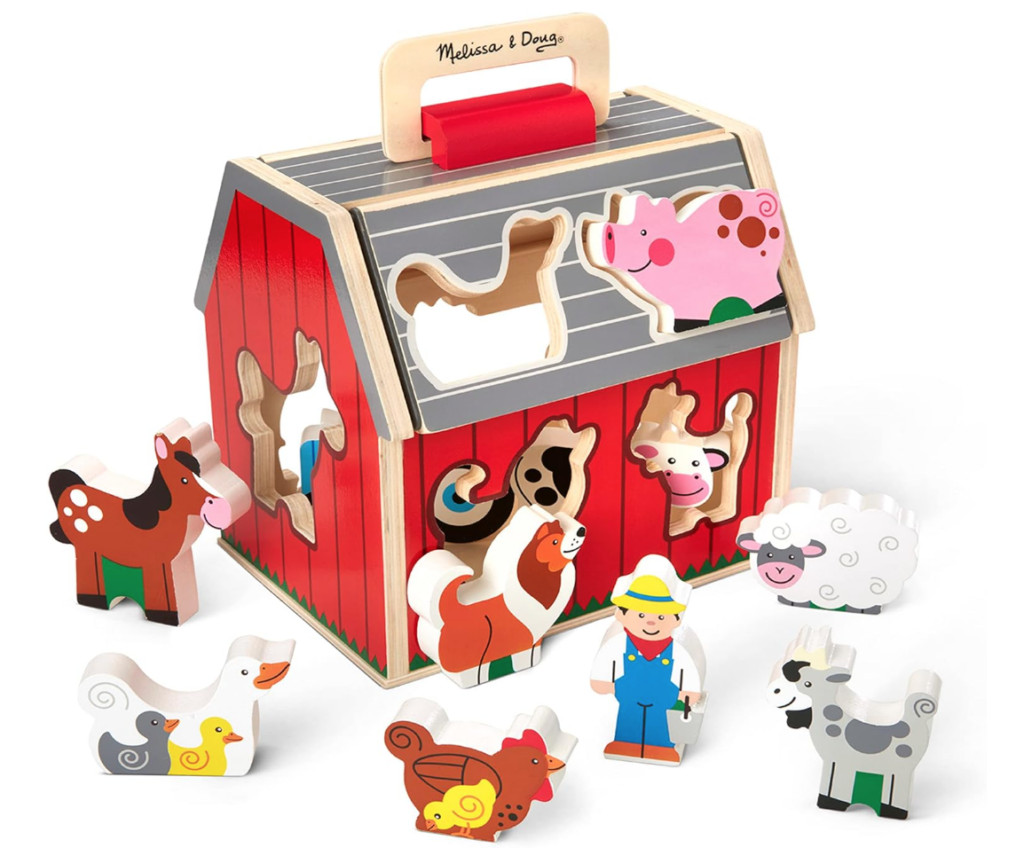 Puzzles are a great toddler toy for so many reasons! Puzzles promote problem-solving skills, and they will also will teach your little one about shape, color, and animal recognition. Here’s the link for the barn puzzle with animals, and here is the link for the shape sorting cube.