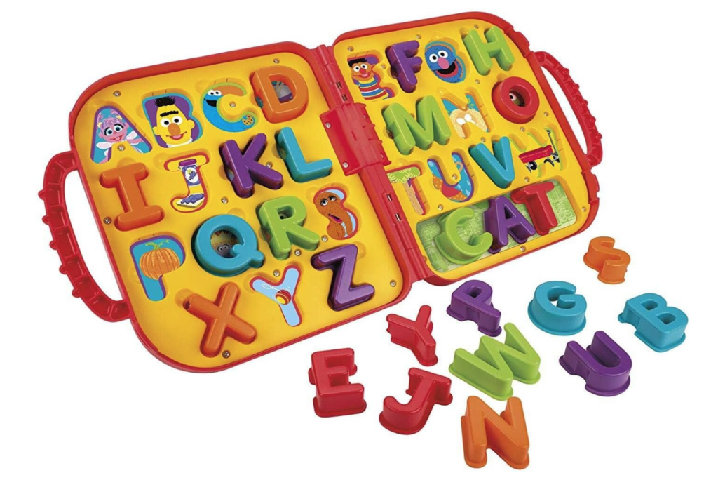 Toddlers really enjoy doing puzzles! Puzzles are a wonderful way for toddler to develop with problem-solving and fine-motor skills along with expanding their vocabulary. This Sesame Street Elmo On The Go Puzzle also teaches toddlers their letters, the alphabet, colors, and characters and objects. Another bonus of this toddler toy is that they travel well. Here is another option that costs a little bit less.