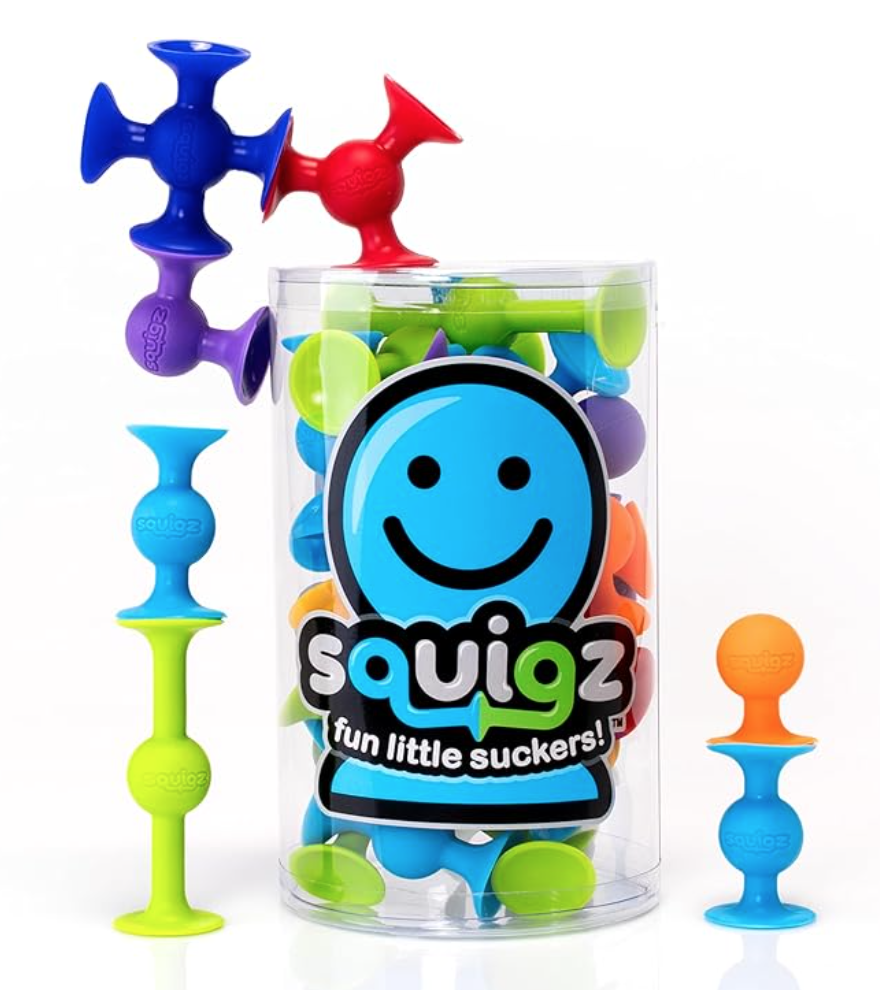 This 24-piece Fat Brain Toys Squigz set includes eight versatile shapes and colors. Crafted from 100% food-grade silicone, these BPA-free, latex-free Squigz stick to each other and any smooth surface, making them excellent for sensory activities. Squigz for toddlers are designed to promote creativity, motor skills, and problem-solving through engaging play. Also, if you’re riding on an airplane soon, pack some of these to keep your toddler occupied for the plane ride.