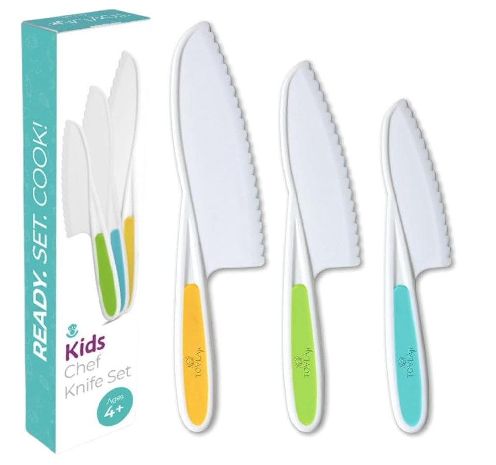 Toddlers love to get involved and help out, which makes these child-safe knives a perfect “toy” for toddlers. Helpful tip: Give them a vegetable to chop, like a bell pepper, and you’ll find they will also snack on whatever you give them so this is a great way to get them to eat more vegetables!