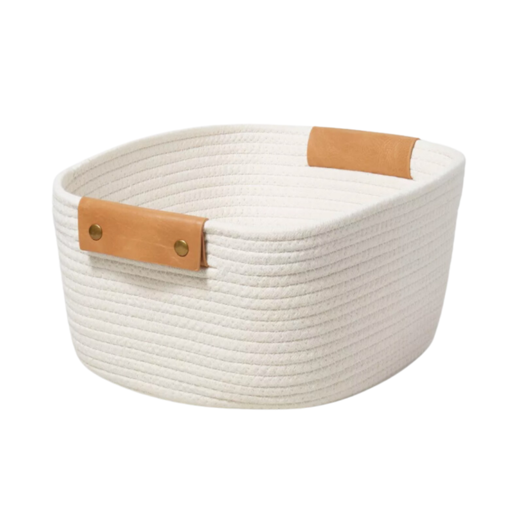 Wicker Storage Basket | White coiled rope basket with leather handles | Pencil case