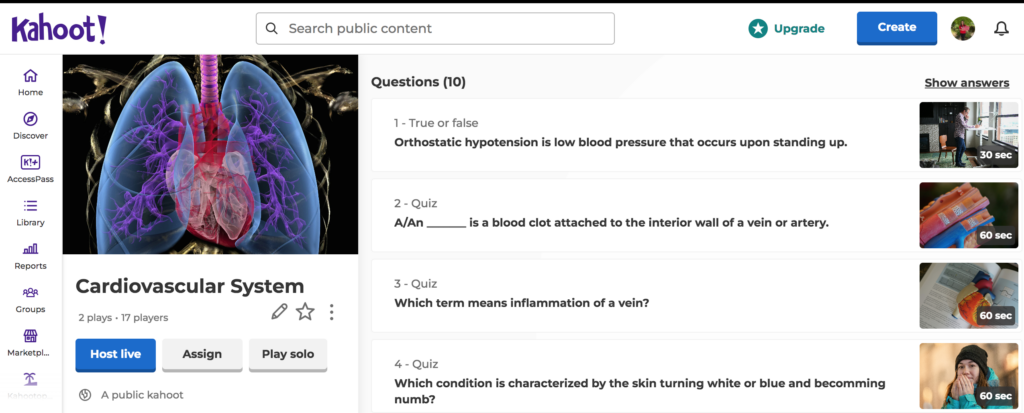 You can create your own Kahoot or there are pre-made Kahoots you can use by using their search engine. Finally, if I use Kahoot for a quiz review, I give the students who place on the podium a couple of bonus points on their quiz.